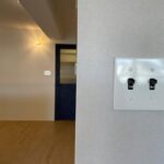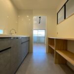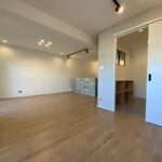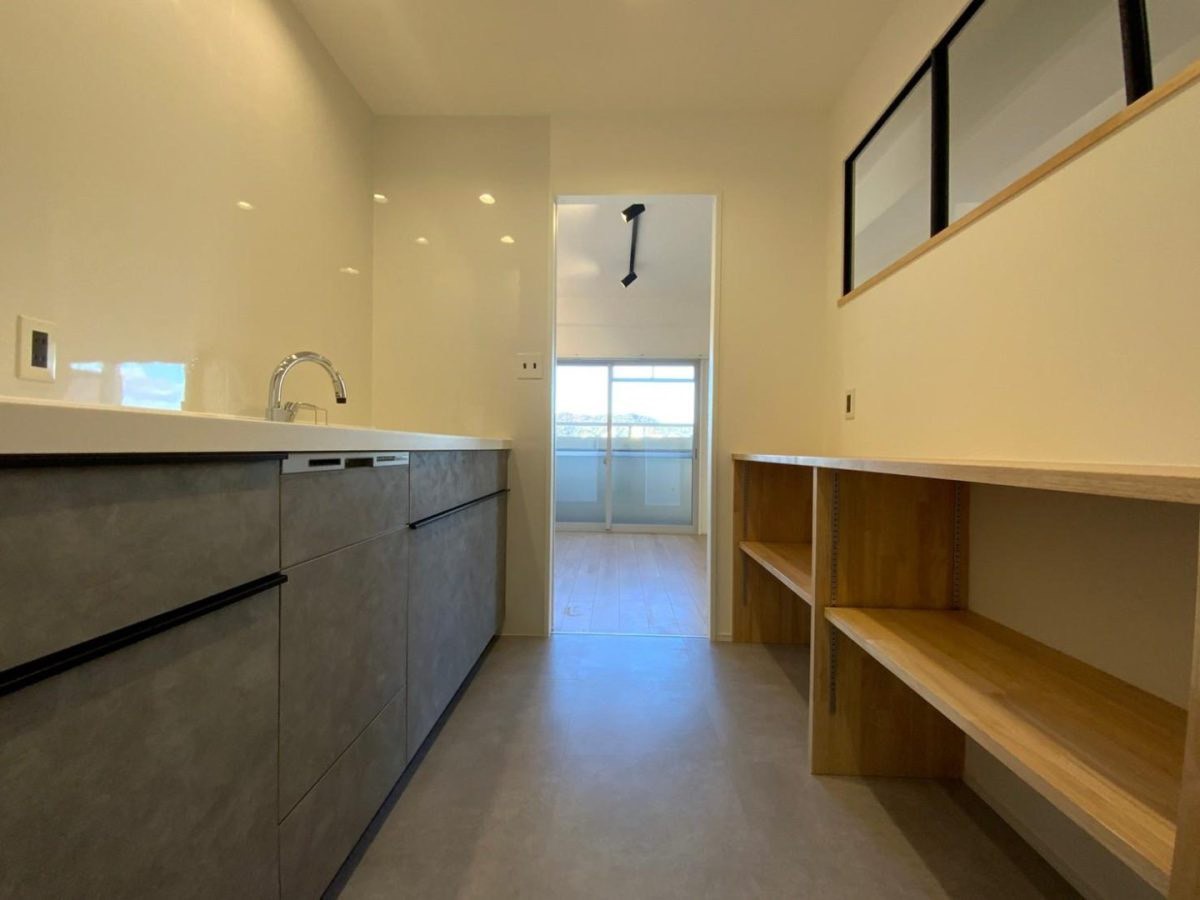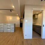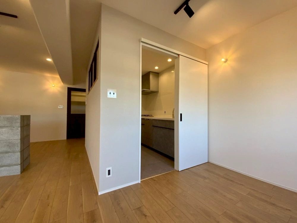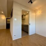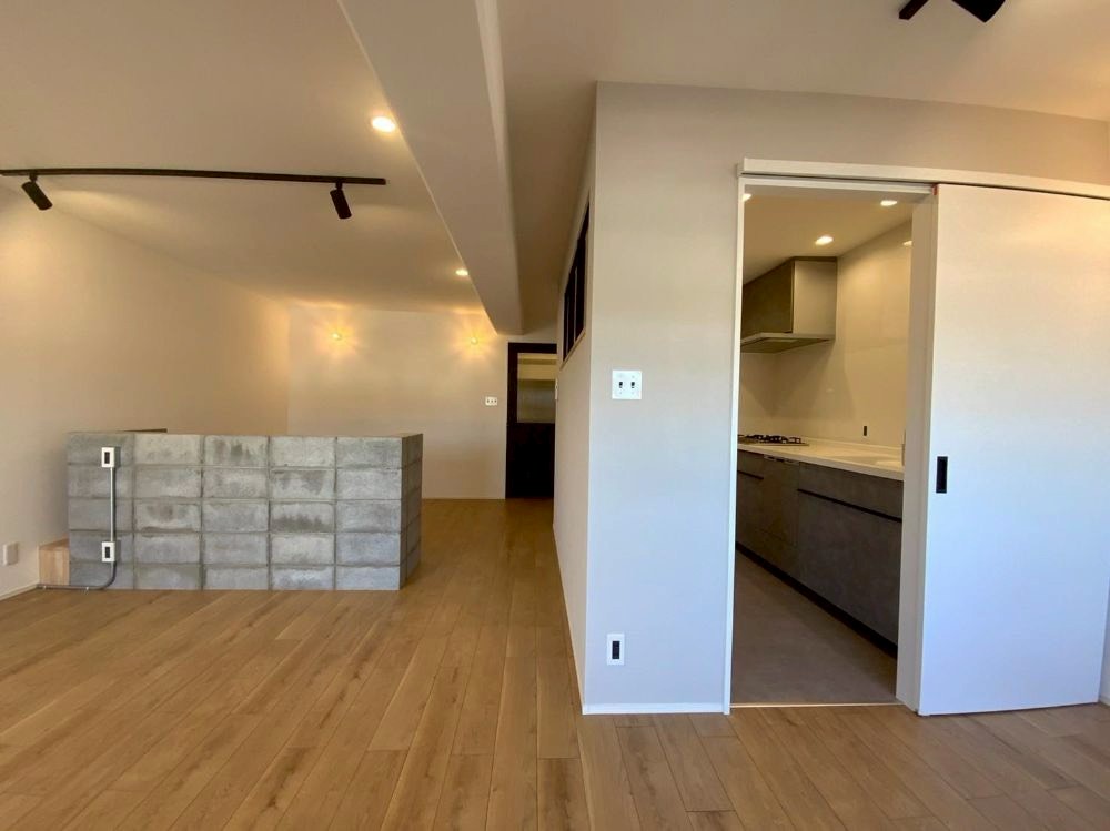 キッチンは猫ちゃんの入れない個室にしましたが、室内窓を設ける事で、お互いの姿を時々確認しながら過ごせるようにしました。寝室とリビングが一緒になったことで、部屋を広く活用できる、生活動線が少なくなるメリットも良いところ。