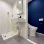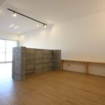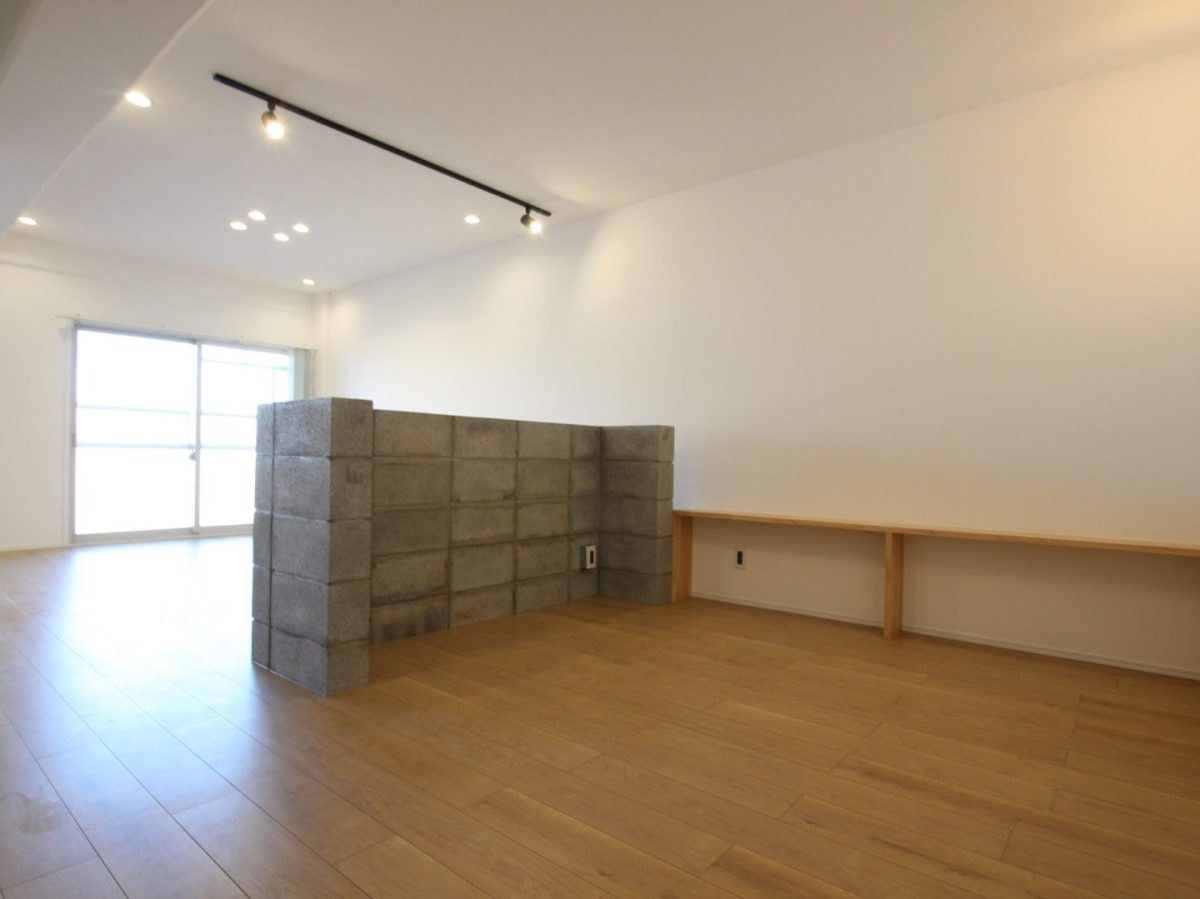 ナチュラルな白や明るめの床材。そこに無機質なコンクリートブロック。