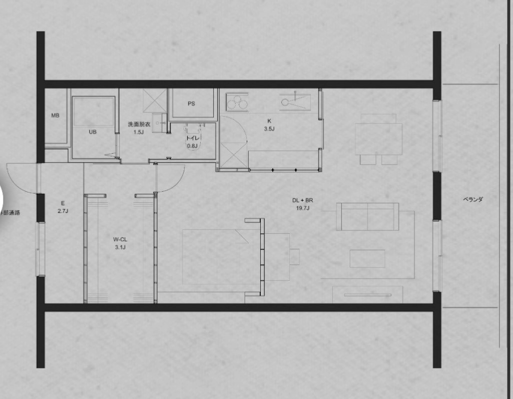 間取りはなんとリビングに寝室を設けた、シンプルながら大胆なリノベーションです。